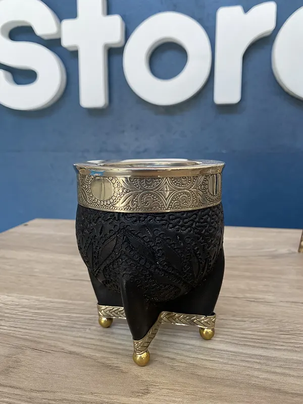 • Material: Mate de Porongo, virola de alpaca, cuero croquelado, patas con puntas de alpaca.